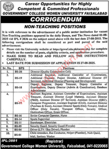 Faisalabad university jobs are now open at Government College Women University Faisalabad (GCWUF). Furthermore, these Faisalabad university jobs invite applications from highly competent and committed professionals for various non-teaching positions. In addition, this corrigendum refers to the original job advertisement published in Daily Dunya and The News on August 1, 2025 (IPL #3836).